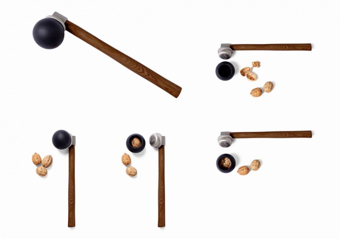 Se trata de un martillo pero tiene una característica especial e ideal para evitar lo que comentábamos antes, que la cáscara del fruto seco saltara por los aires, que poca gracia hace porque después hay que limpiar y porque es una cáscara dura que se astilla, a veces de forma peligrosa, y puede hacer daño. El cascanueces Nut Hammer (nut es nuez y hammer es martillo) es creatividad del diseñador catalán Roger Arquer, que siempre busca la funcionalidad y la estética al realizar nuevos diseños de objetos cotidianos. Afirma haberse inspirado en sus recuerdos de infancia para desarrollarlo.