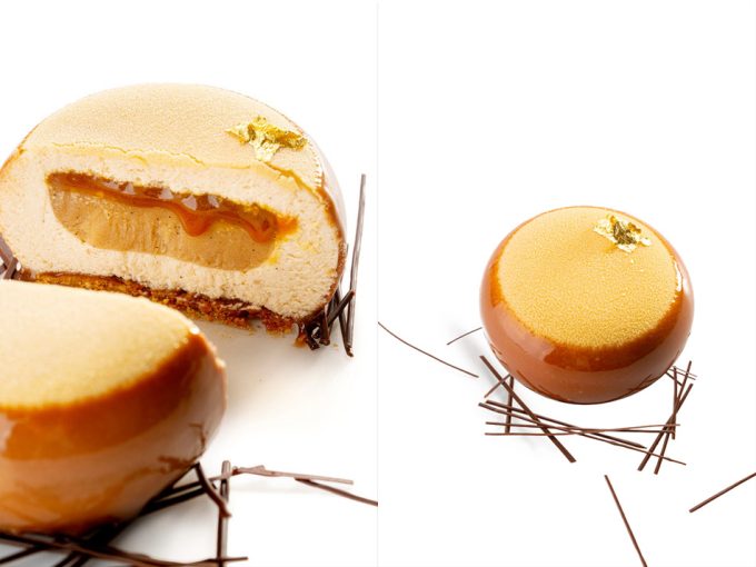 Hervir la leche con la glucosa, la vainilla, la sal y la mantequilla. Escaldar el almidón previamente mezclado con la nata. Hacer un caramelo en seco con el azúcar y cuando esté a 190º C, escaldarlo con la mezcla anterior. Dejar enfriar en nevera y dosificarlo sobre el cremoso interior.