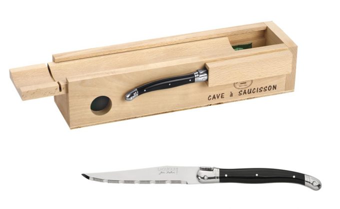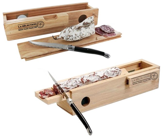 Pero la denominada ‘Cave à saucisson’ no sólo es una caja creada para la conservación del salchichón, como podéis ver en las fotos incluye un cuchillo del estilo de los famosos Laguiole o de la propia marca, que también comercializa este producto. Y tiene una tapa deslizante que hace las veces de tabla de cortar, incluyendo una guía por donde hacer el corte. Y la funcionalidad de la tapa de esta bodega de embutido no acaba aquí, puesto que, una vez cortado el salchichón en rodajas, puede hacer de plato de servicio.
