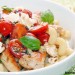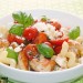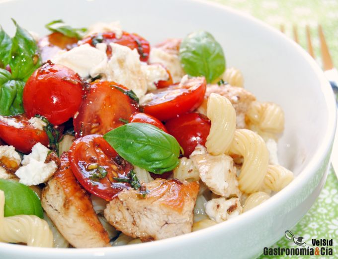 Mezcla la pasta con el pollo y sus jugos, sírvela en los platos y reparte sobre ella los tomates balsámicos y el queso rulo de cabra desmigado, termina regando con la vinagreta y decorando con unas hojas frescas de albahaca. ¡Buen provecho!