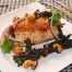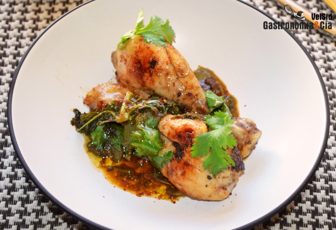 Sirve dos muslos de pollo por comensal acompañados de las verduras y con las hojas de cilanro frescas. ¡Buen provecho!