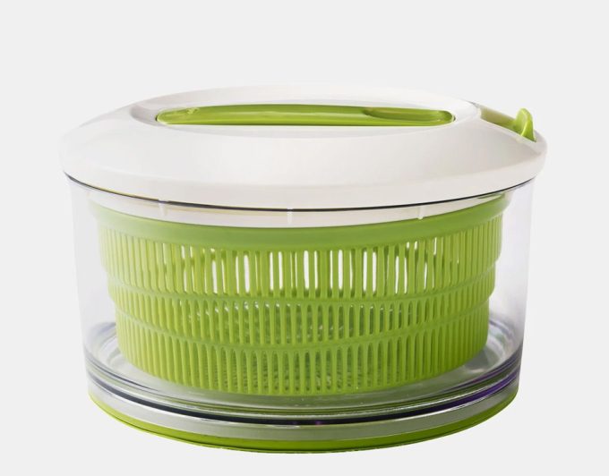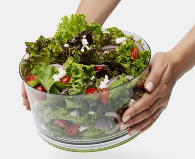 Como habéis podido ver en el vídeo, a este utensilio de cocina se le puede sumar otro uso, y es que el recipiente puede ser el bol en el que se presente la ensalada, pues es simplemente un recipiente transparente que lucirá bien en la mesa en cualquier ocasión. El centrifugador y cortador de ensaladas de Chef’n está fabricado en material plástico resistente, se puede lavar a mano y en el lavavajillas y sus dimensiones son de 24’3 centímetros de diámetro y 15’5 centímetros de alto.