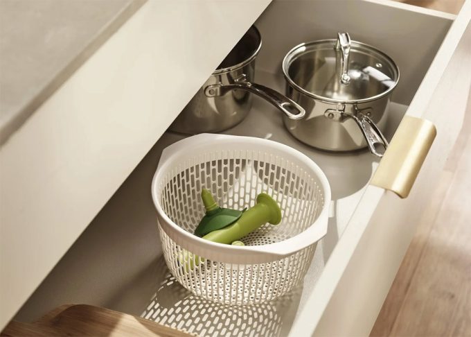 Hoy queremos mostraros un nuevo modelo de centrifugador de ensaladas que sigue siendo grande, pero se compone de menos piezas, puede ocupar un poco menos y tiene la utilidad de colador (como todos los centrifugadores de vegetales) más cómoda y simple, por lo que es fácil que se le dé más uso. En las fotos podéis ver el nuevo centrifugador de vegetales para el fregadero de Joseph Joseph, se llama Spindola™ y lo definen como un colador giratorio para ensaladas en fregadero (In-sink Salad-spinning Colander).