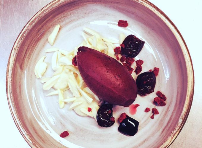 En la foto de presentación podéis apreciar que el postre se compone de un sorbete de cerezas naturales, en su base tiene una crema de almendras que se elabora después de un licuado y de su reducción. También incluye unas cerezas encurtidas que se deben preparar con antelación, y una nota aromática importante de este conjunto es el obtenido por la infusión de tomillo real, tanto en las cerezas encurtidas como en el sorbete de cerezas. Un gran postre que respeta sabores y habla del lugar, una buena receta para poner en práctica distintas técnicas y deleitar a los comensales, ¿tomáis nota?