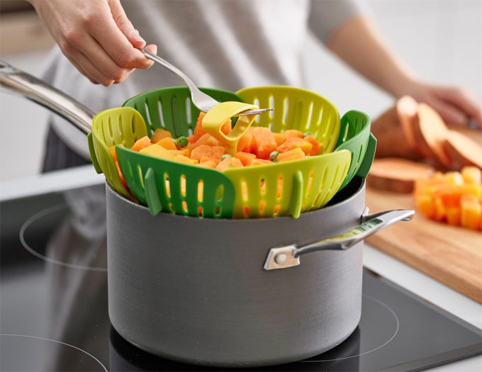 La firma de utensilios de cocina y hogar Joseph Joseph ha diseñado un nuevo modelo de cesta para cocinar al vapor plegable, con algunas características mejoradas y un precio inferior. Si la cocina al vapor es una de vuestras favoritas, posiblemente os interese este nuevo utensilio de cocina, y si hasta ahora no contempláis este método de cocción para preparar vuestras comidas, puede ser el momento de hacer un cambio, pues es uno de los métodos de cocción que resultan más saludables y, además, preserva más y mejor los nutrientes de los alimentos.
