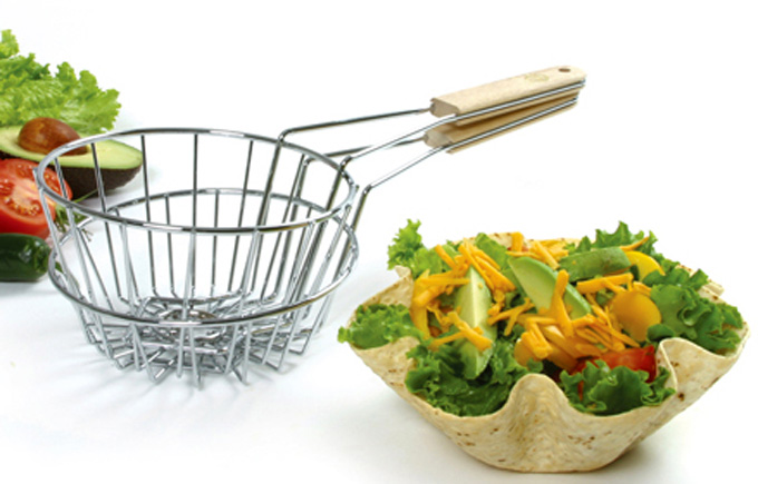 Hay un plato que se ha hecho popular en la cocina americana que se denomina Taco Salad (Taco ensalada), está inspirada en la gastronomía mexicana, es una ensalada de lechuga, tomate, queso cheddar, guacamole, crema agria, carne, fríjoles refritos… y habitualmente se sirve en una cesta elaborada con tortillas mexicanas. Con esta finalidad se ha diseñado la cesta para freír tortillas mexicanas.