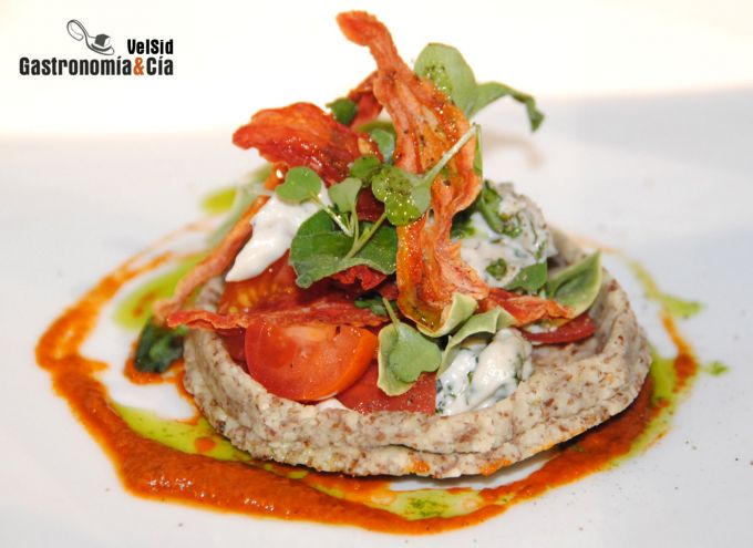 El siguiente plato que elabora es una Tarta de tomate, un plato mediterráneo del que elabora su versión en crudo. Para ello vuelve a utilizar la linaza para hacer la base de la tartaleta, además añade almendras. Da la idea de incluir en esta preparación una setas o alguna hortaliza para enriquecerla en nutrientes y sabor.