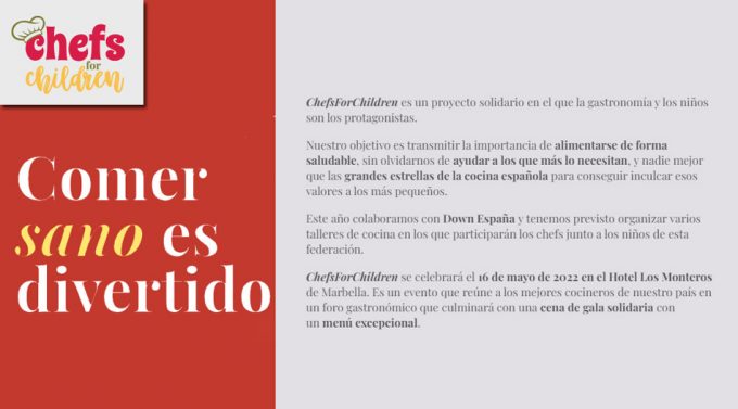 Este lunes se presentó la cuarta edición de la gala solidaria ChefsforChildren, un evento que tendrá lugar el próximo 16 de mayo de 2022 en el Hotel Los Monteros de Marbella, y las entradas ya están a la venta. A continuación os explicamos en qué consiste esta gala, antes vamos a recordar que ‘Chefs for Children’ es una iniciativa que nació hace un par de años con dos objetivos, que los cocineros de renombre de nuestro país enseñen a los niños que cocinar es divertido, así como los beneficios de tener unos hábitos de alimentación y vida saludables, y organizar actos en los que recaudar fondos para donarlos a distintas ONG’s.