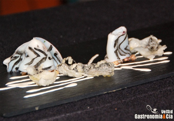 En el momento del pase se le pintan unas rayas al chipirón con la tinta de chipirón, se seca bien (se puede utilizar un secador de pelo) y posteriormente se cocina en aceite de girasol a 70º C durante dos minutos.