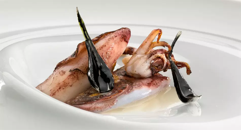 El plato de la sección de Recetas de los Chefs nos muestra la cocina vasca creativa, en esta ocasión de la mano del chef del Restaurante Nerua Guggenheim de Bilbao, con dos elementos estrella, los chipirones y la salsa negra, o su tinta. En la foto podéis ver el plato de Chipirones, cebolletas negras, caldo de arroz y lechuga de mar de Josean Alija, otra forma de ver unos chipirones en su tinta.
