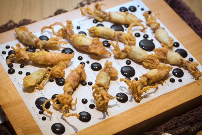 Disponer en el plato los chipirones a la andaluza y repartir gotas de mahonesa de su tinta.