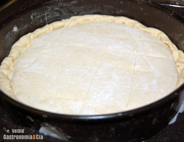 En realidad no hace falta disponer de ningún accesorio especial para hacer las incisiones, basta con utilizar la punta de la hoja de un cuchillo, pero del revés para que no sea demasiado cortante o por la parte afilada si se tiene precisión, normalmente se practican cortes regulares y de forma oblicua, pero también se pueden hacer rombos, ondas… Una recomendación que hay que tener en cuenta antes de hacer el chiquet, es dejar reposar la tarta en el frigorífico aproximadamente media hora para que se enfríe y coja consistencia, pues como sabemos, el hojaldre tiene una importante proporción de mantequilla que a temperatura ambiente y tras su manipulación, se pone muy blanda.