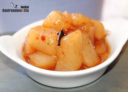 Hemos hecho un Chutney de peras suave con el que esperamos que os animéis a probarlo. Alguna vez ya os hemos comentado que las elaboraciones que incorporan vinagre las suavizamos para adecuarlas a nuestro gusto, por eso veréis que rebajamos la cantidad de éste añadiendo agua. Vosotros podéis hacer lo mismo, así que si os gusta el chutney y os gusta el vinagre, podéis sustituir el agua por más vinagre de manzana, también le va muy bien el de cava, como aplicamos en la receta de Chutney de calabacín.