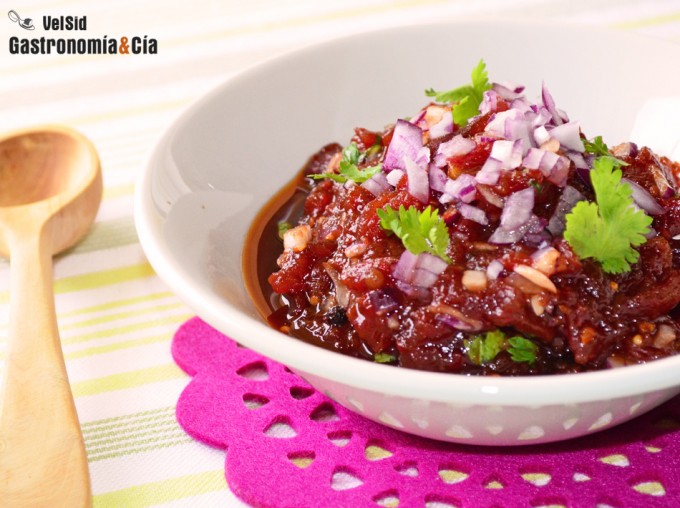Estábamos viendo el programa de Bel Arneson, La Diosa de las Especias, mientras cocinábamos, y cuando preparaba unas Parathas de pollo con chutney dulce de tomate no nos quedó otra que encender otro fuego y preparar ese chutney pero a nuestra manera. Nos llamó la atención la sencillez de la receta y que una vez hecho el chutney, incorporara la cebolla morada cruda, una propuesta que os animamos que probéis.