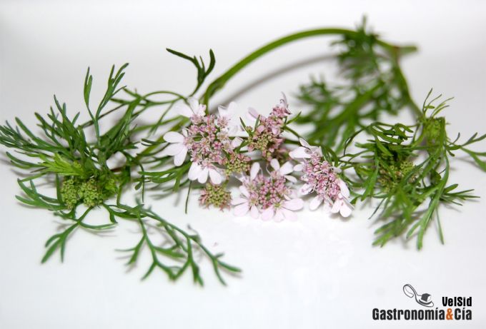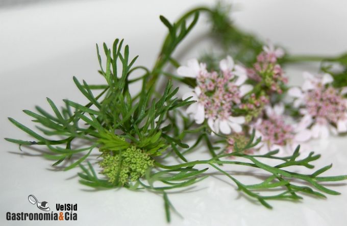 En contadas ocasiones hemos encontrado el cilantro delfino, una variedad del Coriandrum sativum que más conocemos por su aspecto de gran parecido al del perejil. El cilantro delfino tiene unas hojas finas, más parecidas a las del eneldo, aunque algo más gruesas y planas, sus flores pequeñas y rosadas en esta época del año, son también ideales para incluirlas en nuestras elaboraciones culinarias.