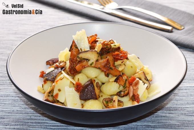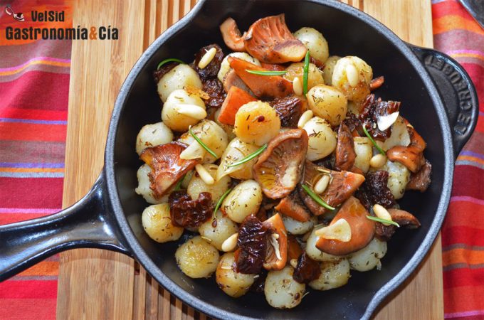 Ñoquis con rebozuelos, shiitake y vinagreta de tomate seco