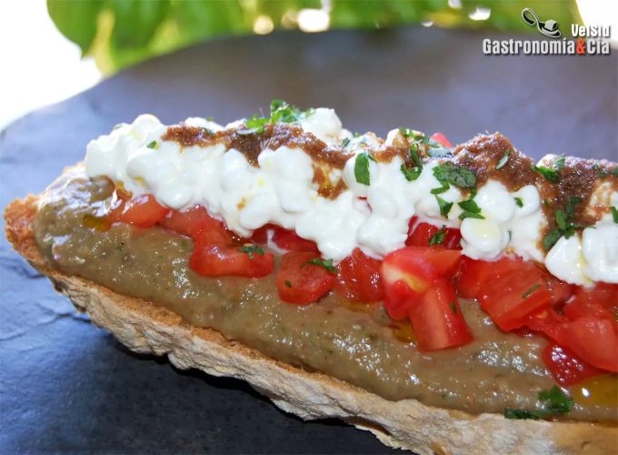 Tosta de berenjena, tomate, cottage y aceite de anchoa