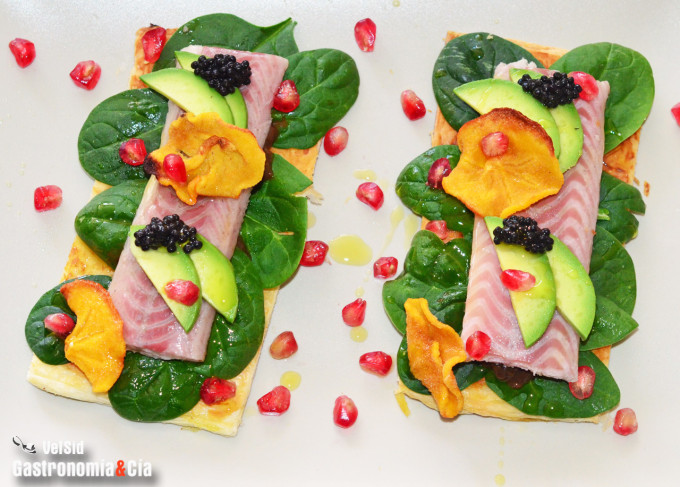 Sobre una base de hojaldre dorado y crujiente dispón los brotes de espinacas, a continuación sirve una cucharada de confitura de boletus, un lomo de anguila ahumada y cuatro láminas de aguacate (disponlas como más te guste). Reparte el kaki persimon, las huevas de arenque y los granos de granada. Termina con un poco de sal Maldon sobre el aguacate y un hilo fino de aceite de oliva virgen extra. ¡Buen provecho!