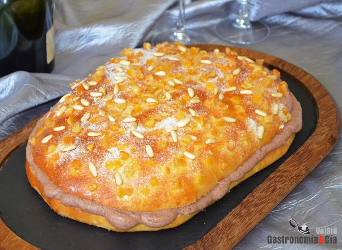 Una vez que la masa haya casi triplicado su volumen, enciende el horno a 180º C con calor arriba y abajo y prepara la cobertura, bate el huevo con unas gotas de leche y pinta la masa, a continuación reparte la naranja confitada, pueden ser daditos o rodajas, los piñones y azúcar.