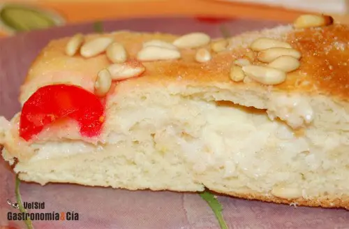 Volvamos con los ingredientes, con los que hemos listado anteriormente puedes obtener una coca como la que ves sobre estas líneas, sólo hay que unir unos y otros, darle tiempo para fermentar, unir otros y unos, amasarlos, darle tiempo, hornear y darle tiempo, en este caso para dejarla enfriar.