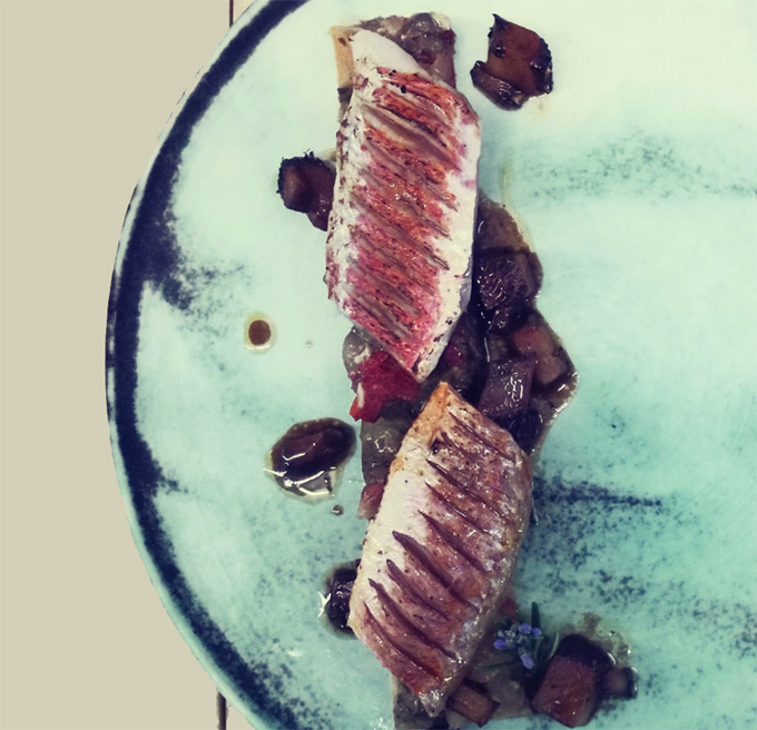 Emplatar la coca, poner encima de cada tira dos lomos de salmonete y terminar añadiendo el níscalo y regando el plato con su jugo.
