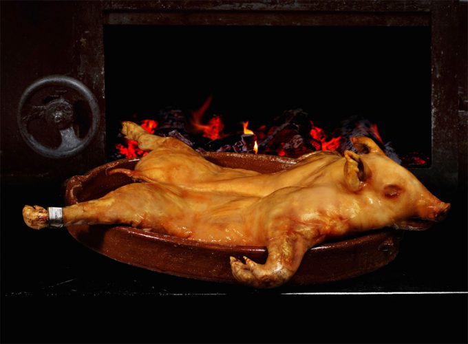 Estando a una temperatura aproximada de 200 grados, introducimos el cochinillo tal cual. Pasadas unas dos horas, lo sacamos, añadimos agua a la cazuela (que se habrá evaporado) y si ha cogido color lo damos la vuelta. Ya con el lomo hacia arriba, se picotea la piel cuidadosamente, le damos una pincelada con aceite de oliva virgen, por todo el lomo y de nuevo lo metemos al horno una hora más aproximadamente. En la última media hora, estaremos pendientes por si fuera necesario proteger alguna parte por exceso de calor: orejas, patas… Cuando consideremos que está la piel dorada y crujiente puede estar asado y a punto, entonces lo sacamos definitivamente del horno y lo presentamos en la mesa.