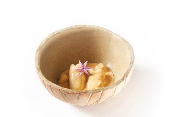 Emplatar en un recipiente cóncavo, de forma armónica y similar a como muestra la fotografía, decorando con una pequeña flor de temporada.