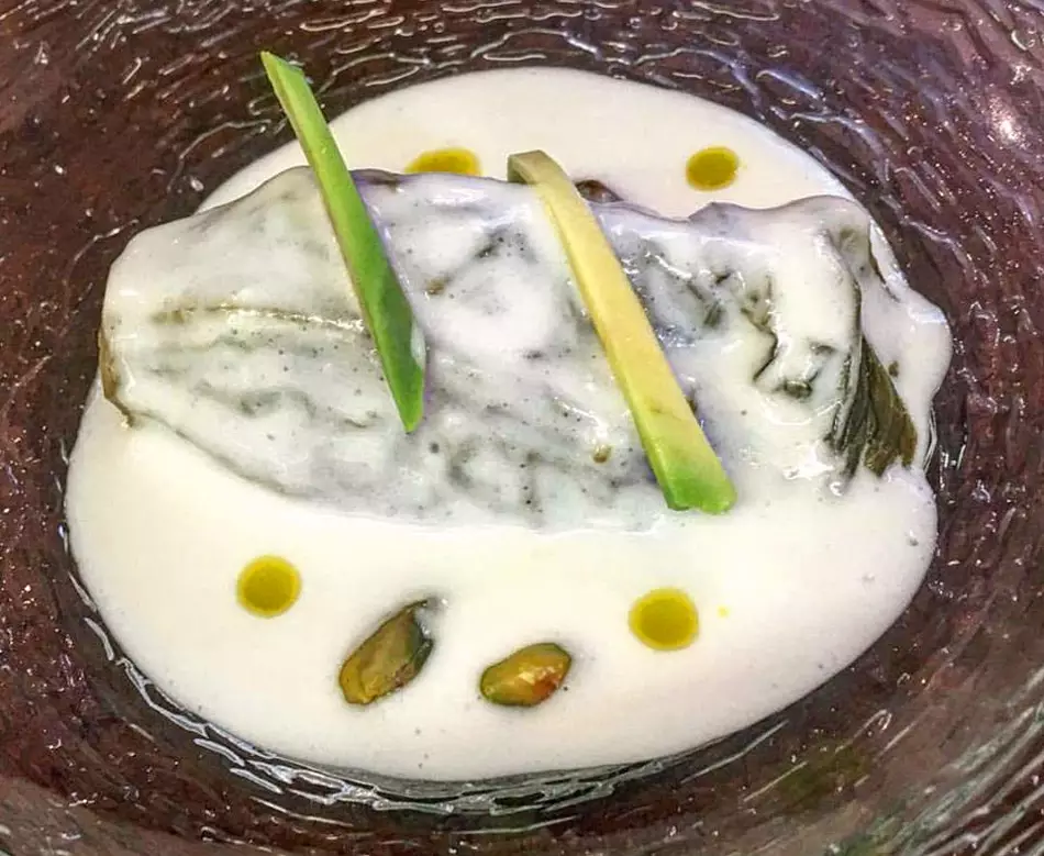 En un plato hondo poner un punto de aguacate triturado, encima poner el cogollo escurrido y napar con la salsa de merluza. Terminar con tres pistachos, dos gotas de aceite de pistacho y unos bastoncillos de aguacate natural.