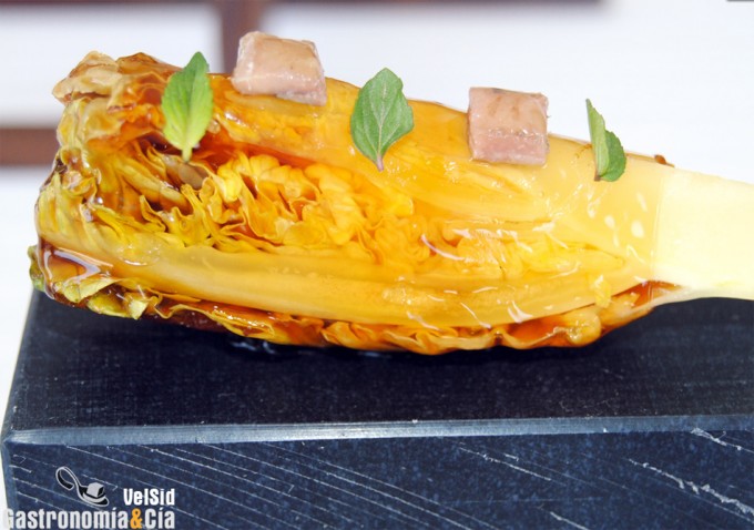 Un plato para comer en tres o cuatro bocados y que sorprende, sin duda, al comensal, es el Cogollo, anchoa, pimiento rojo y menta de Paco Morales. Debemos decir que es un plato muy fresco y que resulta rico en sabores, además de proporcionar un juego de texturas muy agradable en el paladar.