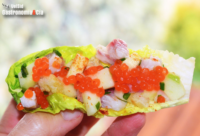 Y eso que al fin y al cabo es un aperitivo muy sencillo y rápido de preparar, utilizamos como base unas hojas de cogollo de lechuga y las rellenamos con una mezcla de anguila ahumada, manzana verde, picatostes recién hechos, huevas de salmón, cebollino… Definitivamente, esta es la receta de un aperitivo sorprendente, un canapé, una barquita, un tartar o un taco muy sabroso para disfrutones, así que no os lo perdáis.