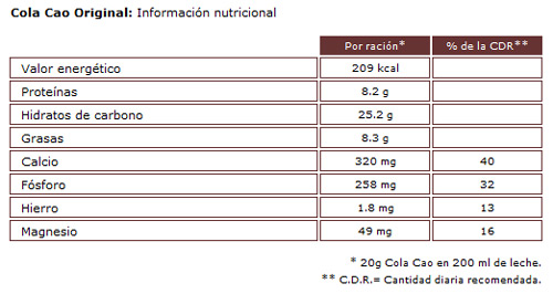 Valor energético 361 kcal (aquí cambia la cantidad recomendada diaria, en lugar de 20 gramos recomiendan 15 gramos de Cola Cao), Proteínas 6’8 gramos, Hidratos de carbono 78 gramos (de los cuales, 70 gramos son azúcares), grasas 2,4 gramos, etc. Si queréis más información de la etiqueta, sólo tenéis que decirlo.