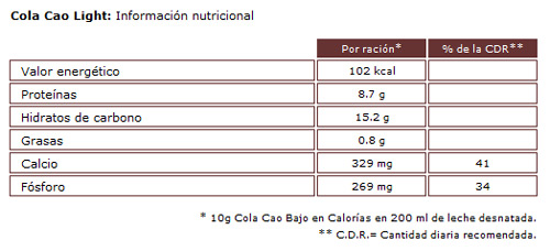 Cuando un asiduo a este producto se pasa del Original al Light, lo último que va a hacer es fijarse en el detalle ‘Por ración’, lo lógico es que si siempre se ha servido dos cucharadas de Cola Cao, lo continúe haciendo con el Light, y más si existe la creencia de que éste aporta la mitad de calorías. Aún es peor, porque los más chocolateros no se conforman con dos cucharadas de Cola Cao.