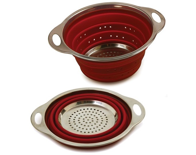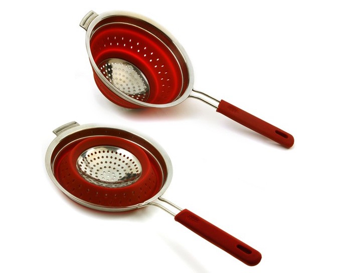 Conocemos varios modelos de coladores plegables, los hay de plástico, de silicona, de acero inoxidable… pero los que queremos que conozcáis en esta ocasión combinan dos materiales, silicona y acero inoxidable, nos han gustado porque además de estar disponibles en distintos tamaños, son muy funcionales, fáciles de guardar sin ocupar mucho espacio y tiene la garantía del fabricante, Norpro.
