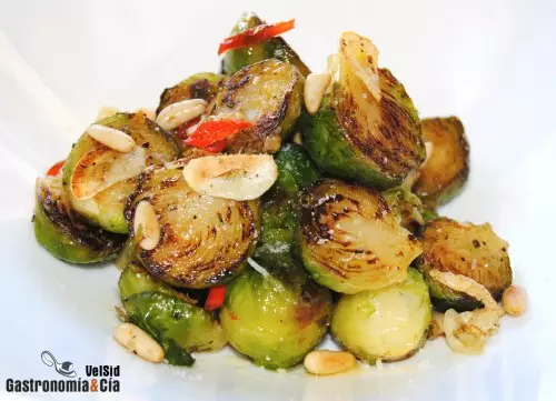 Sirve enseguida las Coles de Bruselas con piñones, ajo y guindilla, una delicia, tus comensales querrán repetir.