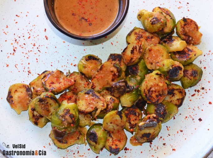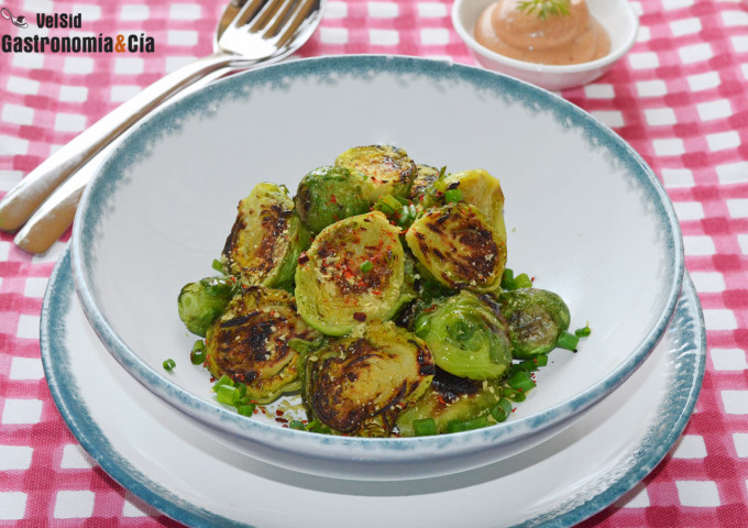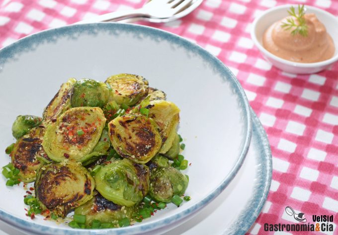 Coles de Bruselas tostadas con salsa vegana de sriracha