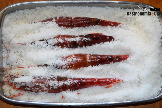 Cubre la base de la bandeja con la sal gorda y coloca los carabineros ordenadamente, a continuación cúbrelos bien con más sal gorda, hasta que no se vean la cabeza, el cuerpo y la cola del marisco.