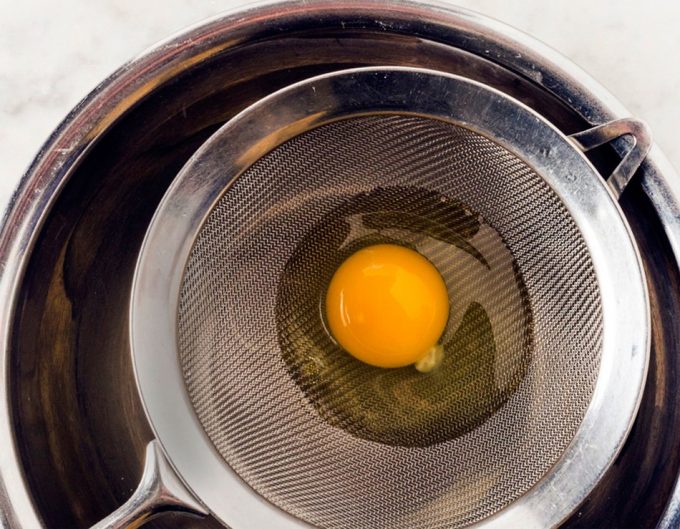 Así que el truco para hacer un huevo escalfado más atractivo, si no se parte de un huevo muy fresco, es deshacerse de esa parte de clara más acuosa, y la forma de hacerlo es muy sencilla, basta con pasar el huevo por un colador o por una espumadera (aunque en esta hay que tener más cuidado para que no se resbale) antes de ponerlo a cocer. Los agujeros del colador permitirán que fluya la parte de clara acuosa, mientras que contendrá la clara que está más espesa y que al introducirse en el agua de cocción quedará unida a la yema, y fácilmente la envolverá.