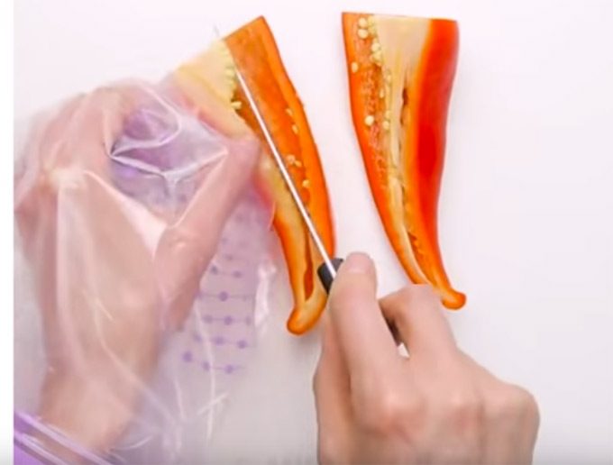 El objetivo es ponerse la bolsa en la mano que debe sostener la guindilla o chile, cumpliendo así la función de un guante. Como veis, es un recurso al que todos tenemos acceso, pues en prácticamente todas las cocinas hay bolsas y no siempre hay guantes. No estará de más recordar que después de utilizar la bolsa para sujetar la guindilla, ésta se lave convenientemente, no vaya a ser que después se utilice la misma para guardar un sándwich y éste sea picante sin querer. Aunque para ello habría que dar la vuelta a la bolsa. En cualquier caso, lo mejor es lavarla.