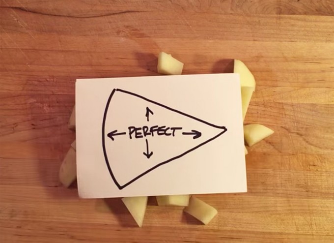 Hay gustos para todo, hay quien prefiere cocer las patatas enteras y con piel para hacer un buen puré de patatas. Lo cierto es que se pueden cocer enteras, cortadas, con piel, sin piel… recordad los trucos para hacer un puré de patatas cremoso en este post. Nosotros no queremos hablar de puré de patatas ahora, sino del método que Alton Brown utiliza para cortar las patatas en triángulos.