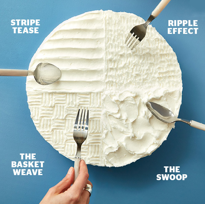 Con el nombre de Ripple Efect está la técnica para decorar el frosting con un tenedor, simplemente introduciendo los dientes del cubierto e intentando dibujar unas olas. La tercera propuesta se llama The Basket Weave, y de lo que se trata es de imitar la textura de una cesta, para lo que es necesario arrastrar los dientes del tenedor alternando su posición, horizontal y vertical, hasta cubrir toda la superficie. The Swoop es el sistema que ya os hemos comentado antes y del que podéis ver el vídeo pulsando en el enlace que os hemos dejado más arriba.