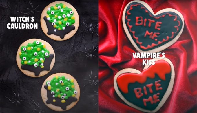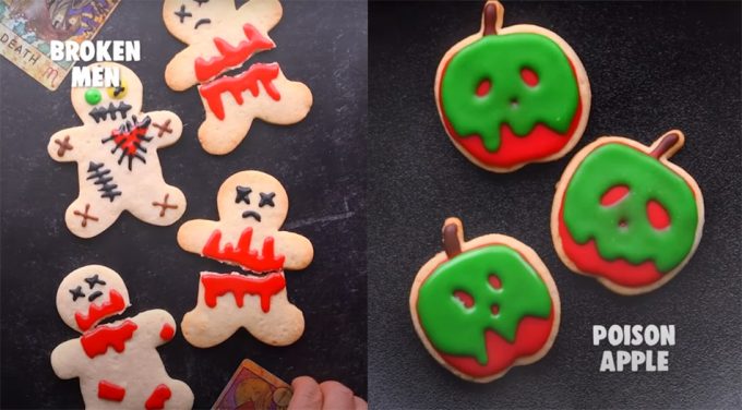 Pero a nosotros os han gustado más las ideas de galletas para Halloween con moldes básicos, pero que precisan de glaseados y frostings para decorar y convertir un hombre de jengibre en un cadáver sangriento, un corazón amoroso en un Frankestein, una apetecible manzana en una manzana venenosa, una clásica galleta ‘María’ en un caldero de brujas lleno de ojos, un lindo gatito en un oscuro y sigiloso gato negro…