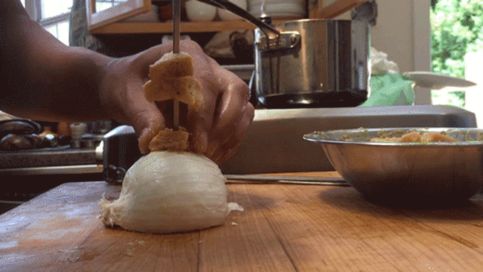 Bajo estas líneas vais a ver cómo ensartar la carne en la brocheta sin riesgos de haceros daño en las manos con el palito, aunque la foto ya es muy clara, la imagen en movimiento os ayudará a verlo más claro. Es tan sencillo como colocar el trozo de carne que hay que ensartar sobre la cebolla y desde arriba, clavar la brocheta, se pinchará la cebolla, pero no demasiado si se controla la fuerza.