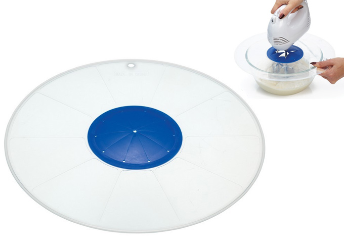 De todas formas, a muchos de vosotros os gustará saber que hay accesorios de cocina destinados a evitar las salpicaduras cuando utilizamos la batidora, podéis ver un ejemplo en la siguiente foto, se trata de una tapa anti salpicaduras para el bol de la batidora, se puede adaptar a distintos recipientes, siempre que su diámetro sea inferior a 30 centímetros, esta es la medida de la tapa.