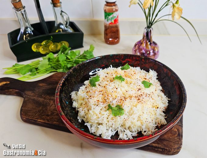 Tras este breve reposo, destapa la olla y verás un arroz suelto y esponjoso, sutilmente aromático, en tus manos queda condimentar como más te guste. En casa vamos a temporadas, ahora simplemente le añadimos Tajín y aceite de oliva virgen extra.