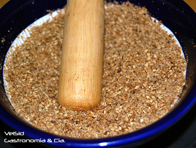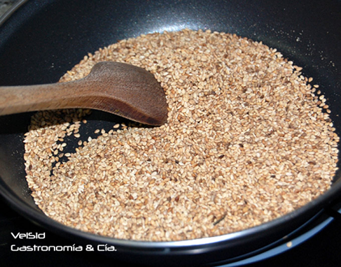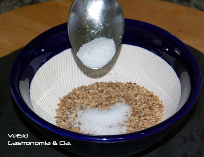 La sal también hay que tostarla, 30 – 40 segundos. luego el sésamo, como se explica aquí, y después todo eso junto a la licuadora.