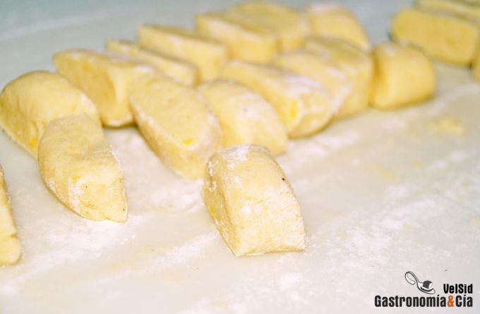 A continuación corta los ñoquis con un cuchillo bien afilado (si queréis probar este truco…) y dales forma, puedes hacerlo con un tenedor, haciendo rodar cada ñoqui sobre el tenedor, o utilizando la tabla de madera especial para hacer ñoquis. También se pueden hacer simplemente bolitas.