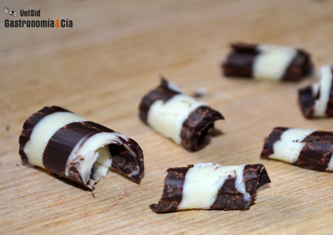 Como podréis ver en las fotos que ilustran esta sencilla técnica, os mostramos cómo hacer virutas de chocolate para decorar utilizando dos variedades, el chocolate negro y el chocolate blanco, con lo que quedará muy llamativo para muchos postres. Pero también se puede hacer sólo con un tipo de chocolate o con otras combinaciones, como más os guste. Esperamos que os sirva este recurso que podréis utilizar siempre, pues lo mejor de todo es que se puede elegir la marca de chocolate que más os guste, y seguramente os saldrá más económico que comprar las decoraciones hechas.