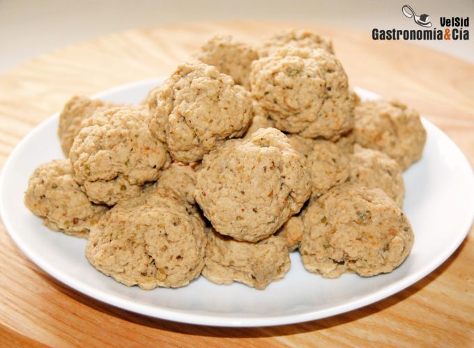 Puedes dejarla reposar, como en la receta de seitán anterior, o proceder directamente a darle forma. Nosotros en esta ocasión hemos hecho unas albóndigas como podéis ver en las fotos, hay que hacerlas pequeñas, pues con la cocción aumentan de tamaño.
