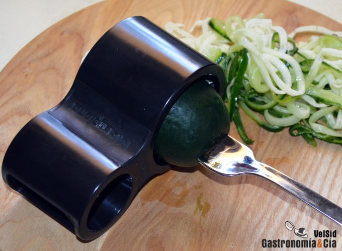 Este cubierto se pincha en el extremo de la hortaliza y así nuestra mano sujeta el tenedor en lugar del vegetal, alejando los dedos de las cuchillas, se evita el riesgo de cortarse o lastimarse. No es una tontería, porque las cuchillas de los buenos espiralizadores están muy bien afiladas y no necesitan mucho para provocar un accidente en la cocina.