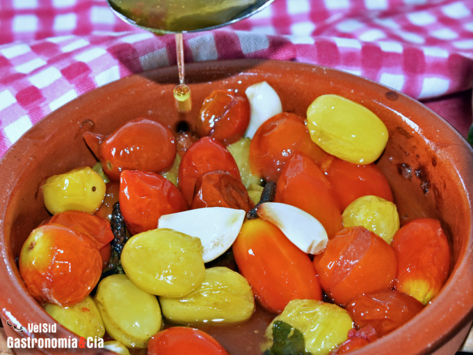 Los tomates cherry confitados con ajo, pimienta y albahaca están listos, aderézalos de nuevo con el aceite que hay en la cazuela antes de servir, y a disfrutar. ¡Buen provecho!